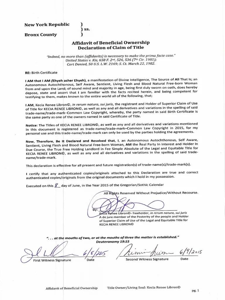 Affidavit of Beneficial Ownership Declaration of Claim of Title
